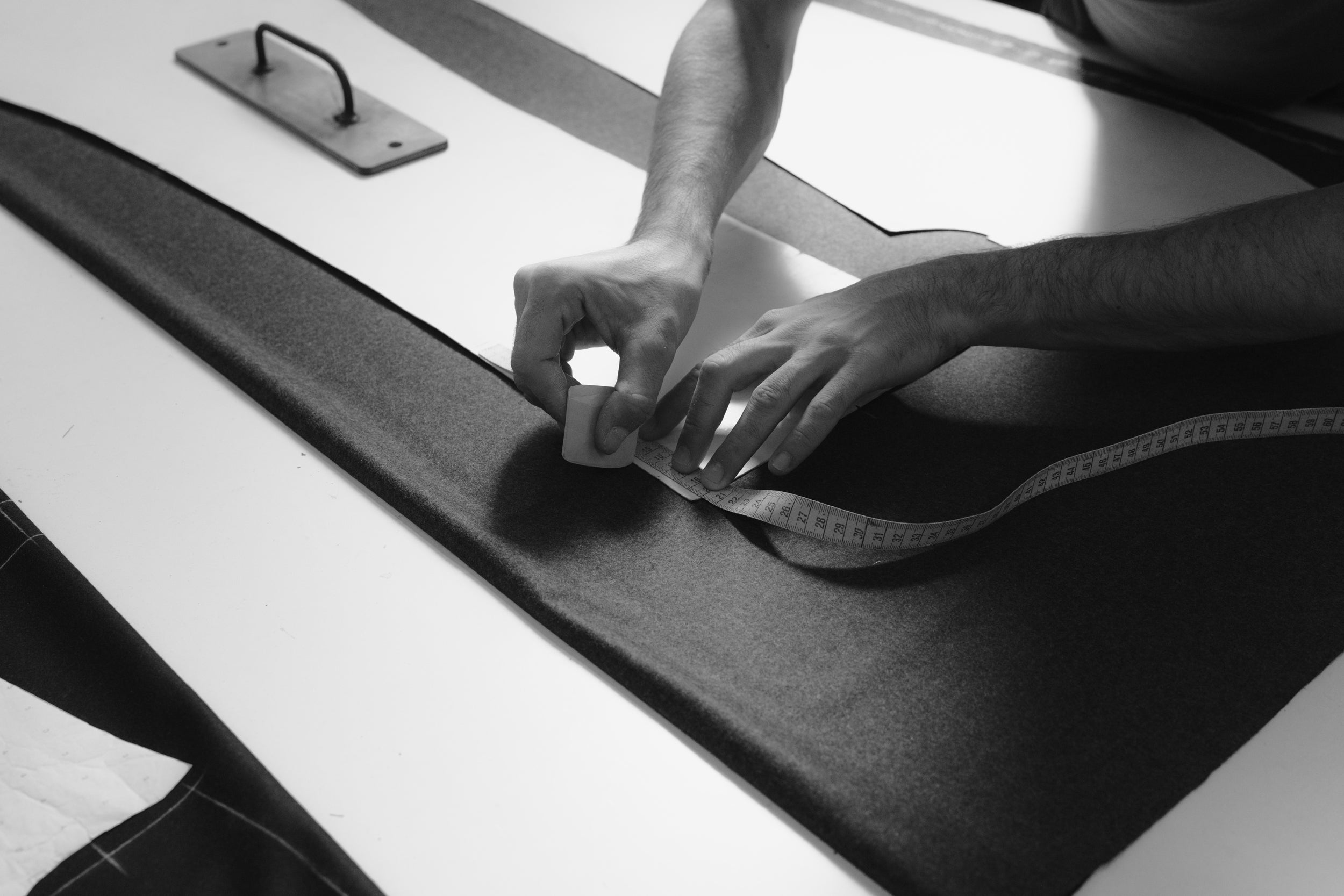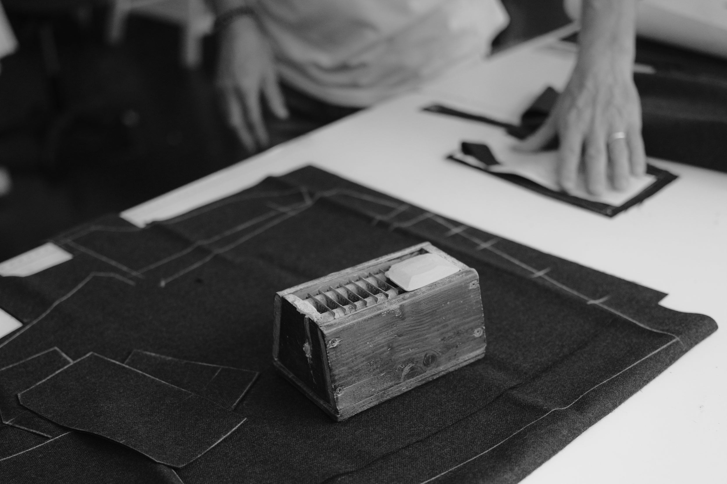 Each pair of trousers is tailored in an Italian workshop dedicated exclusively to trouser making, using patterns we have refined over many years. Paper patterns are laid on the cloth and marked with chalk before each piece is cut by hand, a method unchanged because it produces the most precise result.